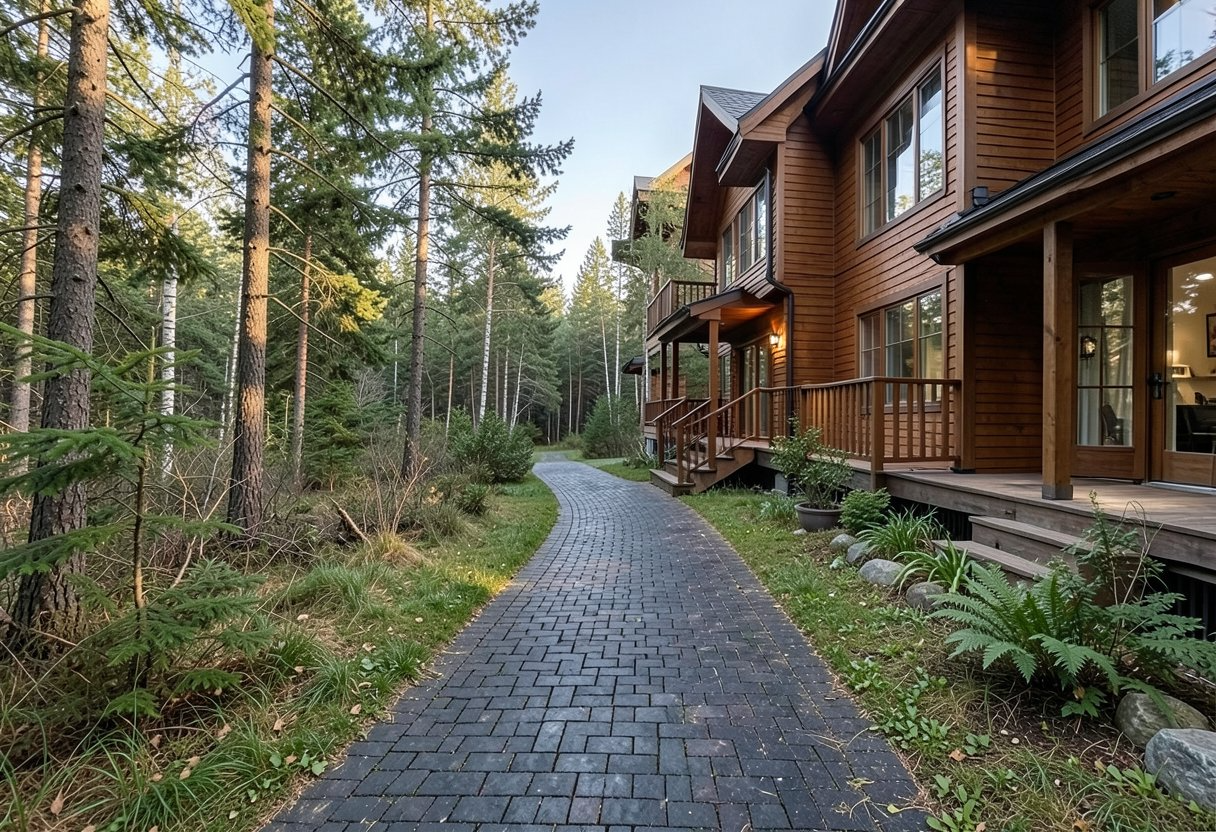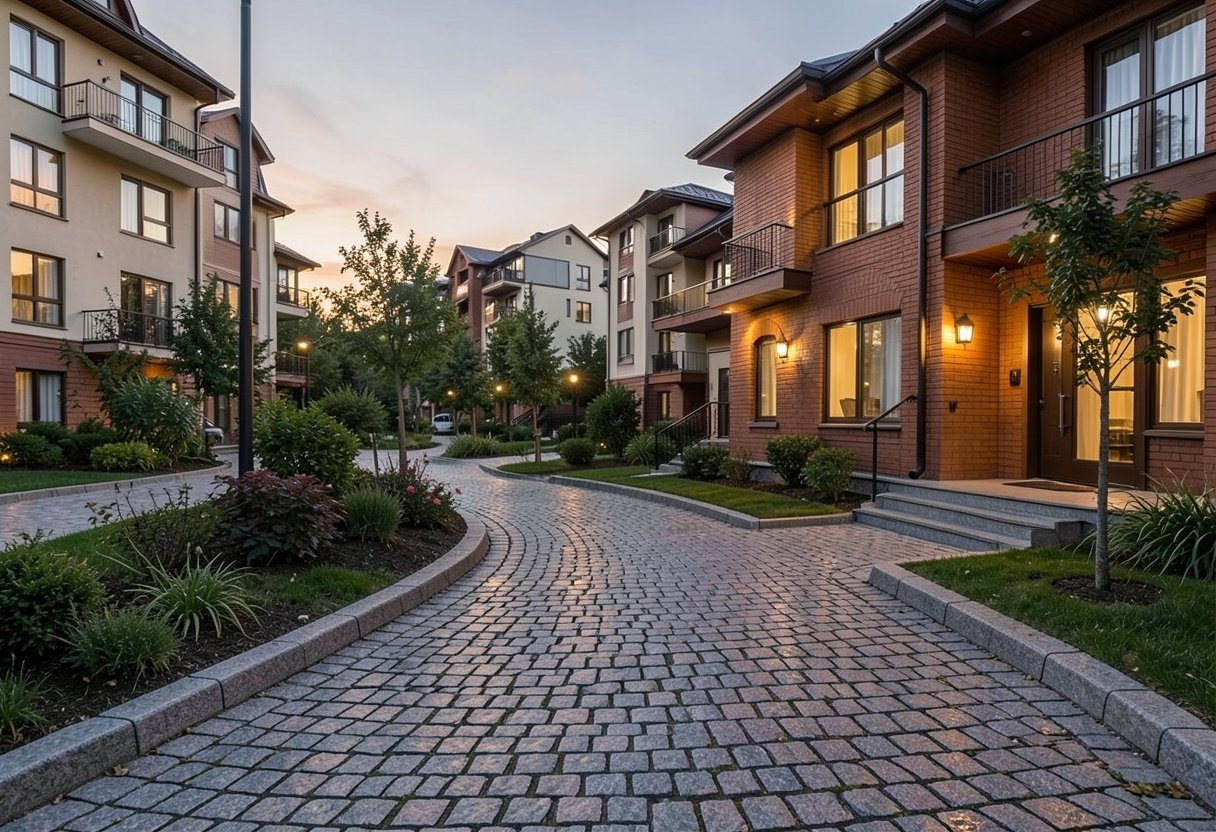Дорожки, террасы, въездные зоны и прогулочные маршруты формируют ощущение гармонии и завершённости.